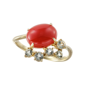 【14.5号】K18YG 血赤サンゴ イエローダンビュライト Japanese Beauty リング COR 2.50ct DB 0.30ct