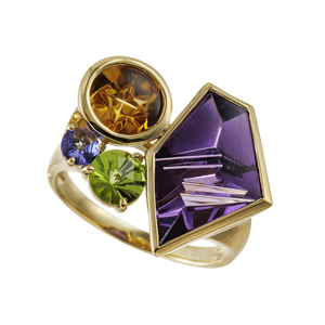 JSM54809: 【20号】K18YG ムンシュタイナーカット アメシスト シトリン スピリットサンカットペリドット タンザナイト リング AM 5.08ct CI 1.38ct PE 0.70ct TA 0.17ct