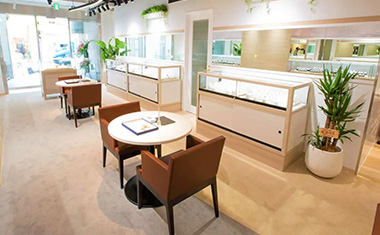 新宿という場所にふさわしく洗練された中にも、温かみのある落ち着いた雰囲気でデザインされており、壁紙には数々の宝石を産み出す地層を表現いたしました。